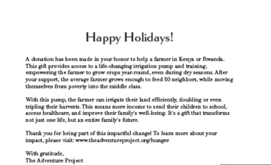 Help one farmer gain access to irrigation in honor of a loved one. We'll send a personalized card detailing your awesome impact.